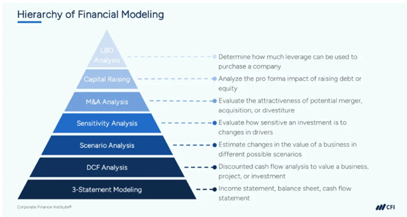 Fig. 2: The pyramid hierarchy of financial modeling with 3-Statement Modeling at the foundation. (Source: CFI’s Introduction to 3-Statement Modeling course)