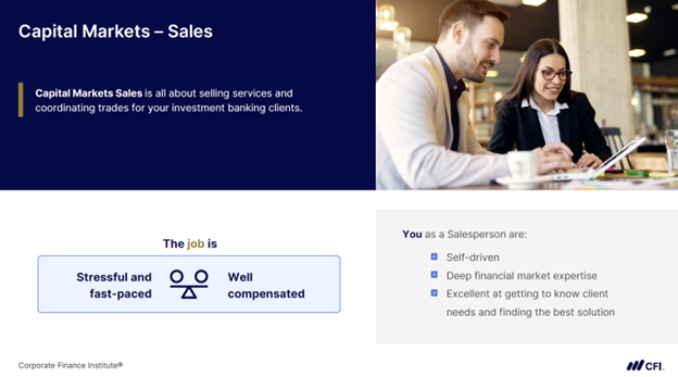 Fig. 4: Capital markets sales and trading is about selling services and coordinating trades for your investment banking clients. (Source: CFI’s Careers in Finance course)