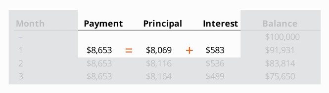 Many amortizing loans feature monthly, blended payments. Loan payments are called blended because they feature a principal portion and an interest portion.