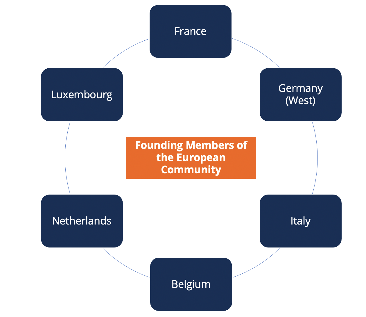 Each community included the same six founding members who signed the treaties. The six founding countries included France, Germany (West), Italy, Belgium, the Netherlands, and Luxembourg.