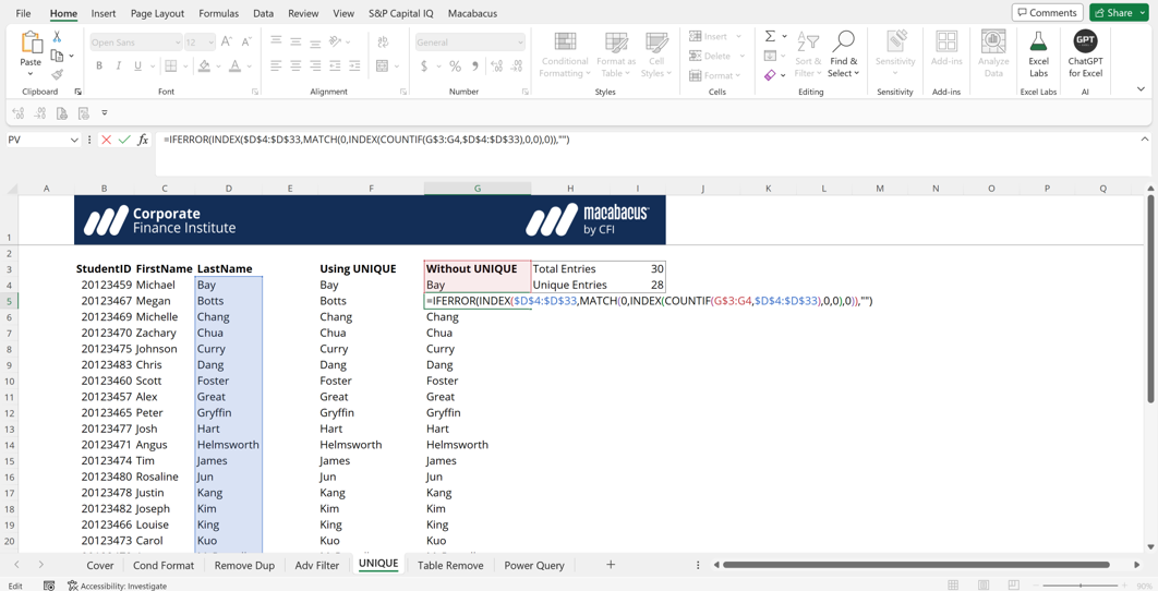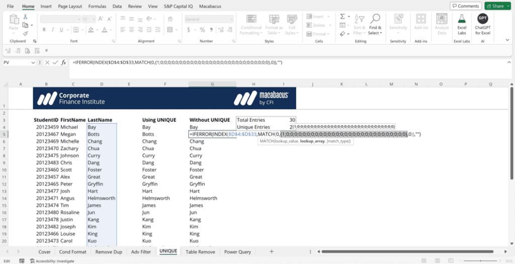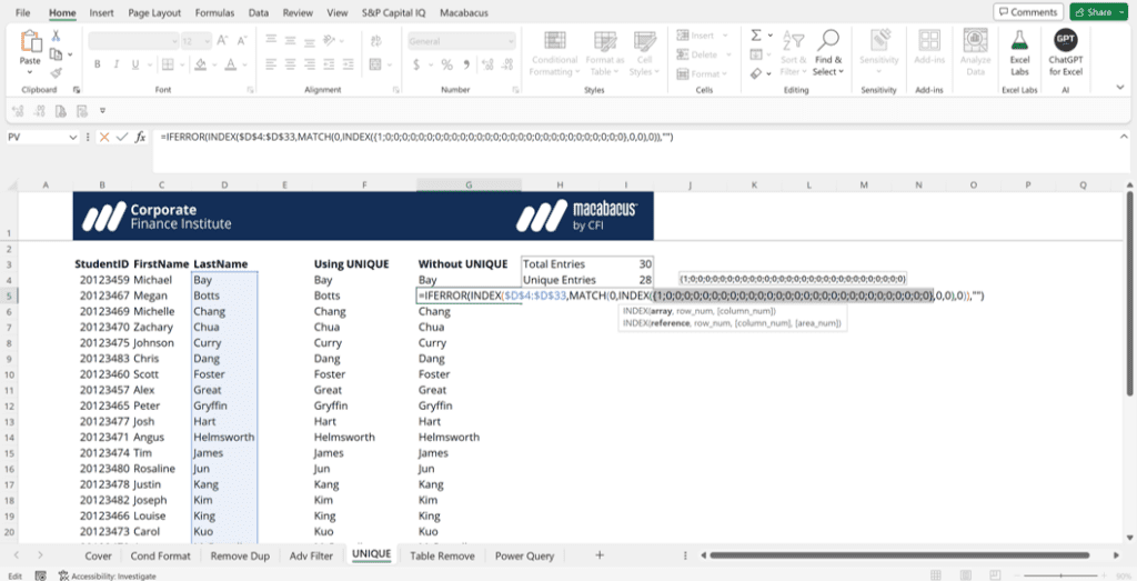 Notice the light blue outline the two orange arrows are pointing to in the screenshot above. The UNIQUE function is what is known as a dynamic array formula. Dynamic array formulas can return arrays of variable size. These formulas create what is called “spilling” in that the formula is automatically and dynamically copied down to capture the appropriate data. In this case, the UNIQUE function pulls out all unique last names and spills the formula down 28 rows (there are 28 unique last names and 30 total entries, as shown in the screenshot above).