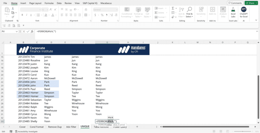 The IFERROR function simply returns an empty cell if there is an error with the INDEX/MATCH combination. An empty cell can be created by using two double quotes with no space: “”. A #N/A error is returned when all of the unique names have been captured. Since all of the unique values have been extracted for our list, we are left with a couple of blank cells, as shown in the screenshot below.