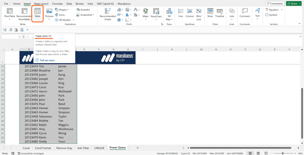 In order to use Power Query for this, we first need to convert our data to an Excel Table. Select the applicable data, then go to Insert on the Excel ribbon and select Table. Alternatively, you can use the shortcut key Ctrl T.