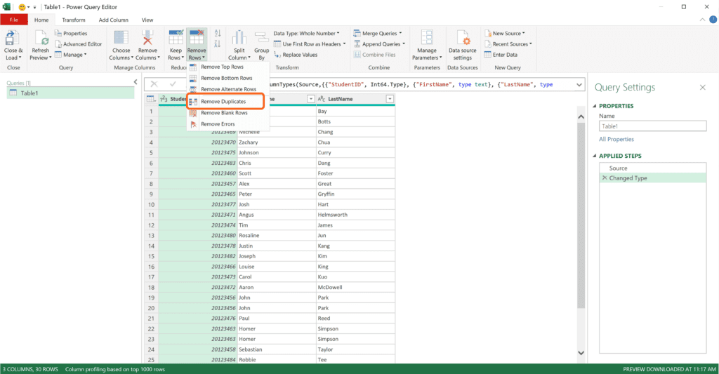 After this, you’ll notice there are now only 28 rows versus the original data, which had 30 rows. Additionally, there is a Removed Duplicates step under Applied Steps in the Power Query Editor.