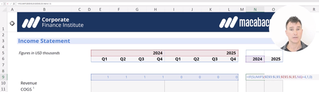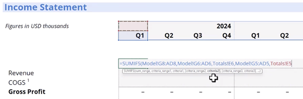 The SUMIFS Function in Excel precisely aggregates monthly data while maintaining the sign conventions established in your model. It allows you to sum values that meet multiple criteria — ideal for consolidating monthly financial data into quarterly views.