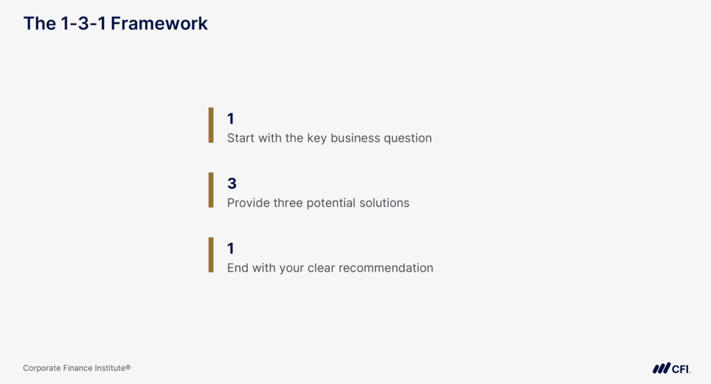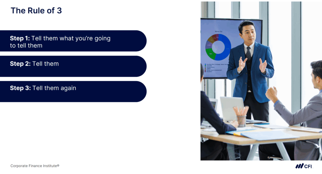 The Rule of Three is a simple narrative structure that improves clarity and retention. You start by stating your key insight or recommendation, then walk through your supporting points, and end by reinforcing the main takeaway.
