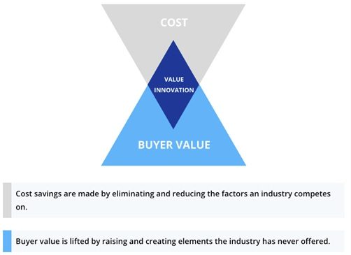 Value innovation is the core principle behind the Blue Ocean Strategy. It involves creating new value for customers with differentiated products or services, while simultaneously lowering costs.1 Companies do this by challenging industry assumptions and reshaping their offerings around what buyers care about most.